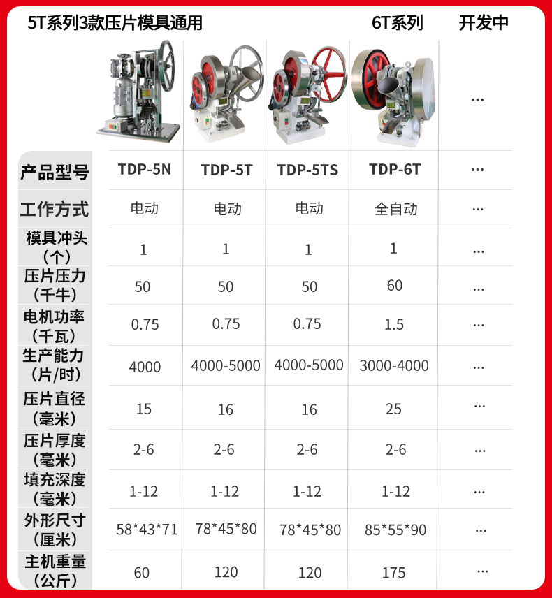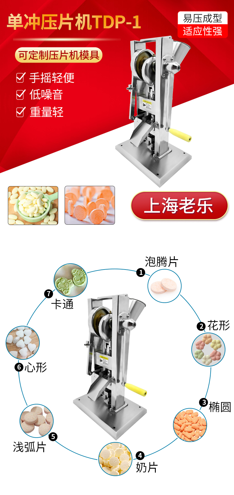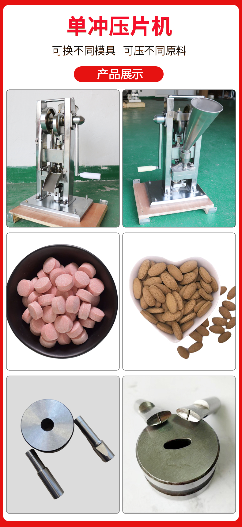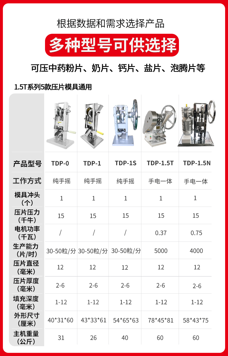 压片直径范围:4-12mm (自带 1 个规格模具,现货有 4,5,6,8,10,12MM,任选一个,可另购,自