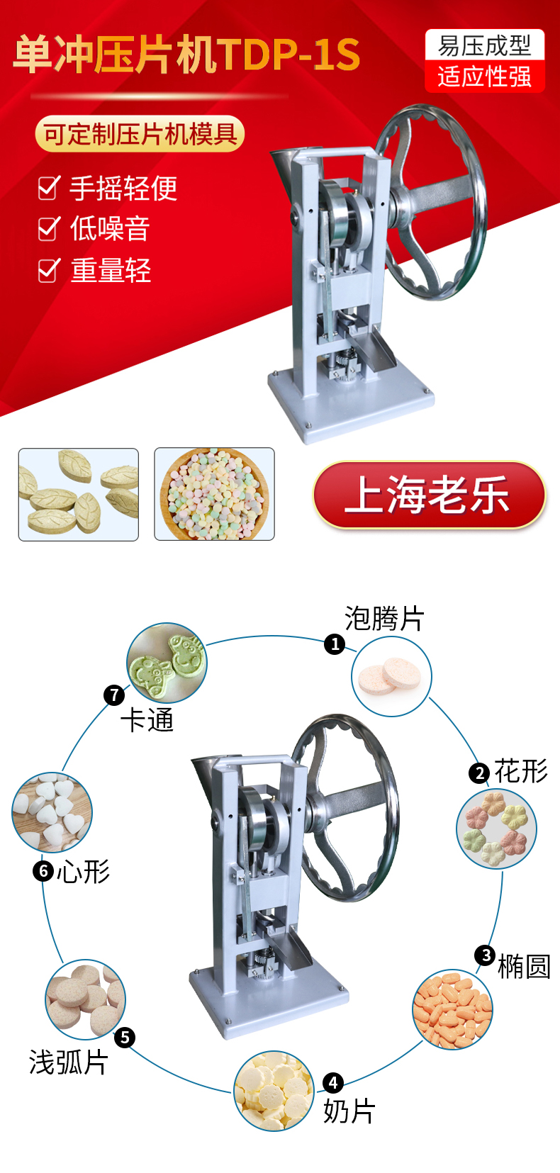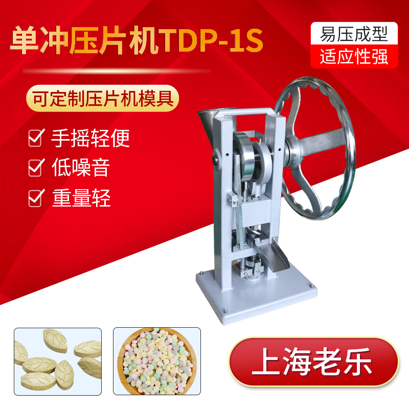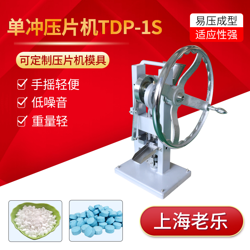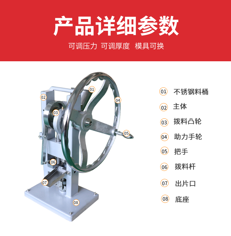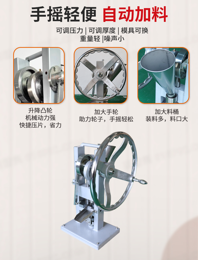 大手轮助力,转动更加轻松 纯手摇、手动小型单冲压片机,机器轻便易移动 连续加料,连续出片,压力、重量可调 自带圆形模具,其他模具可定制,可更换