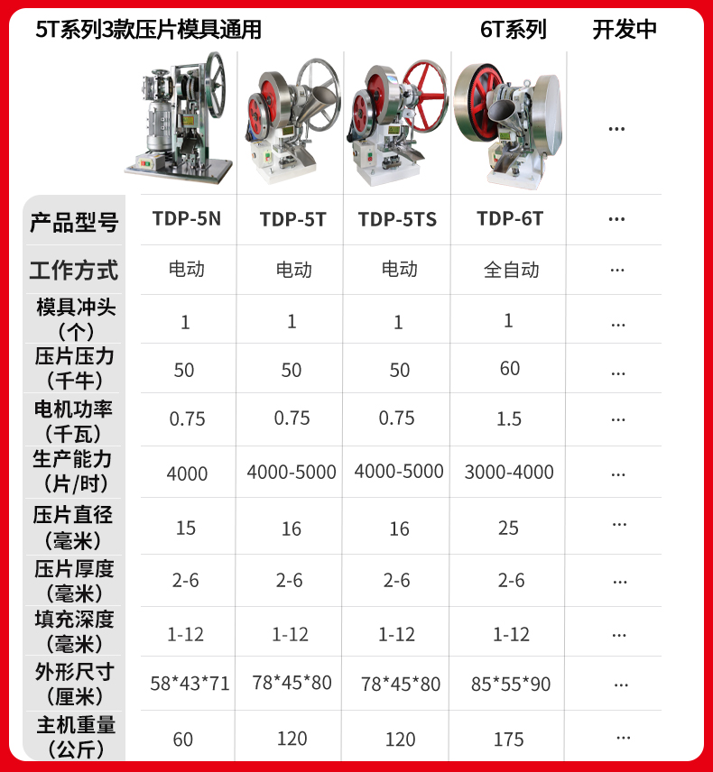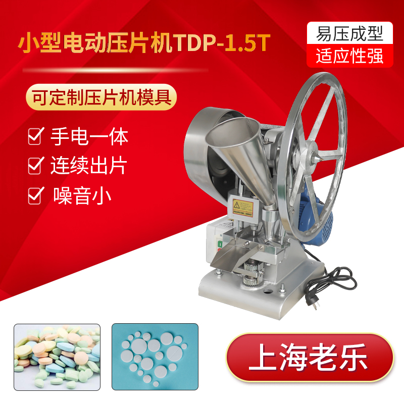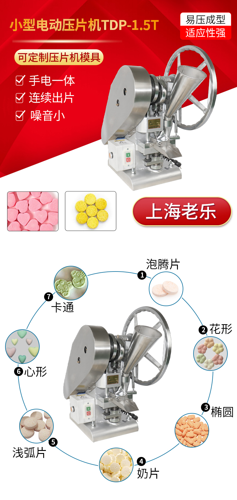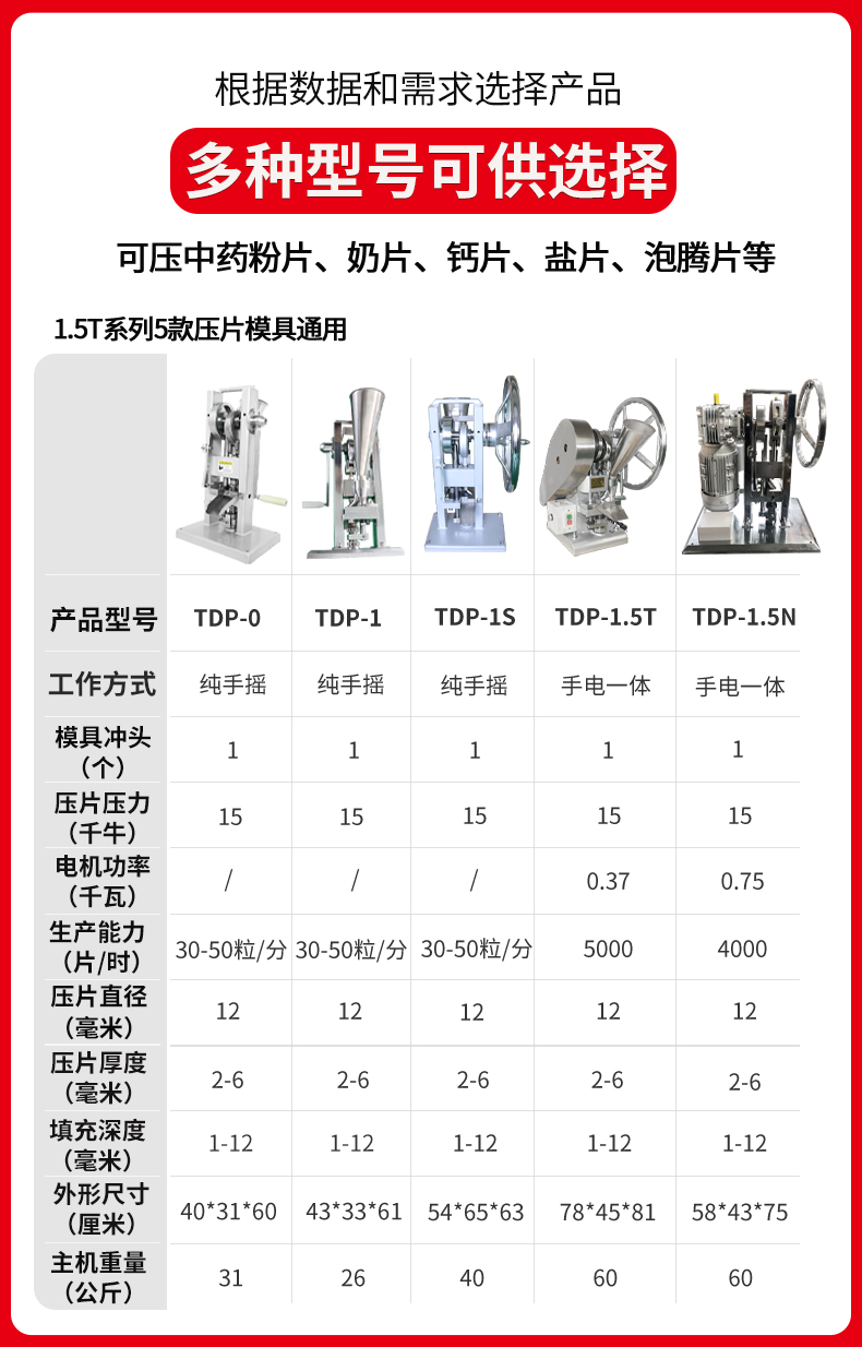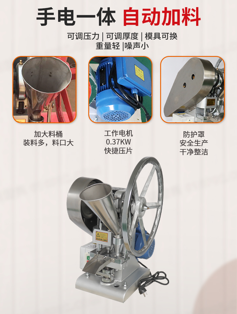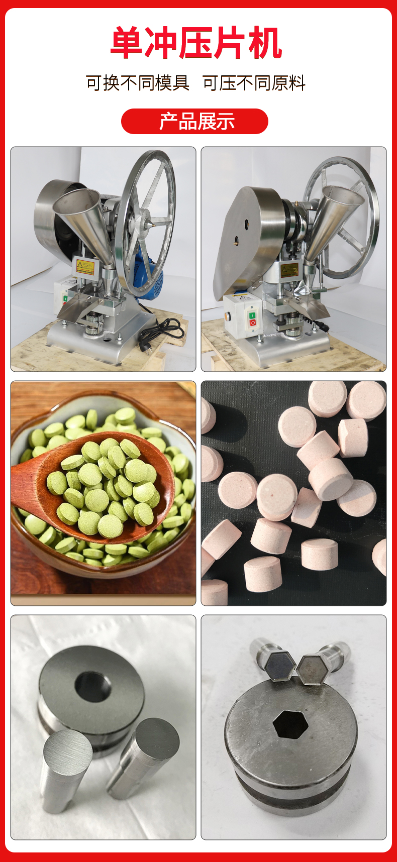 压片直径范围:4-12mm (设备自带一个规格模具,现货有4、5,6,8,10,12MM,任选一个规格,可以另外购买,自己更换,也可以定做异形模具)