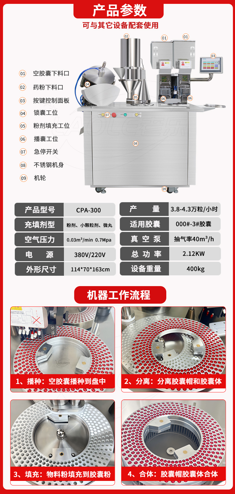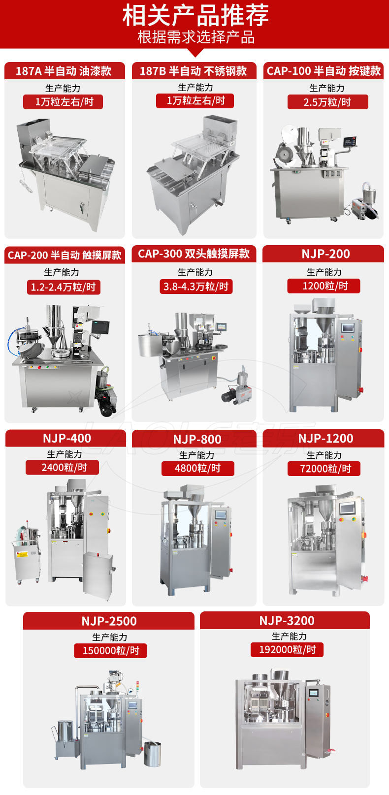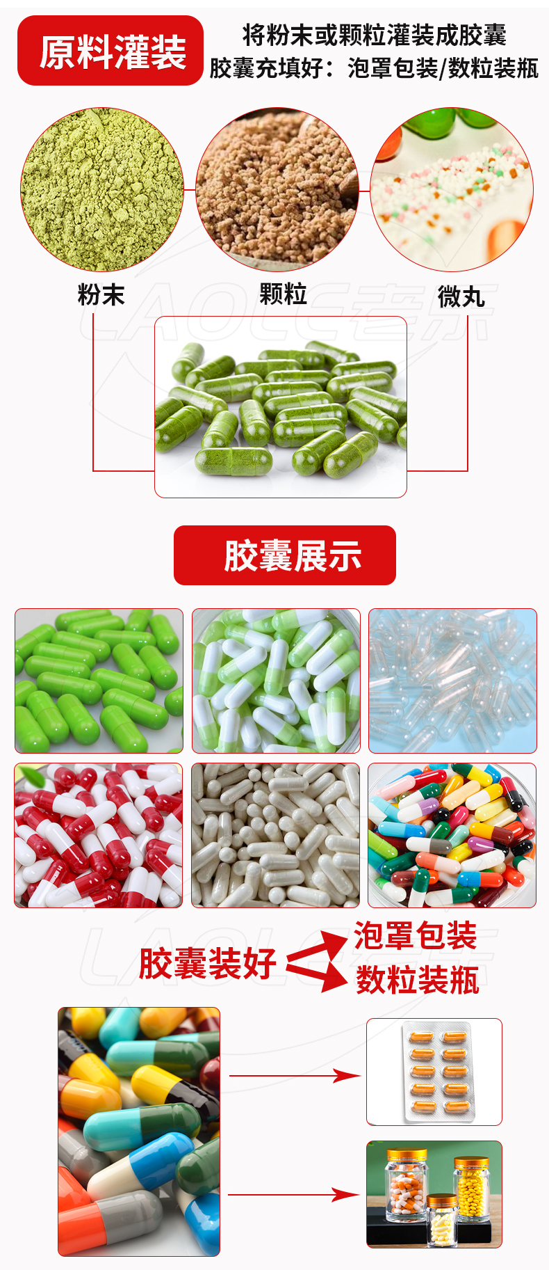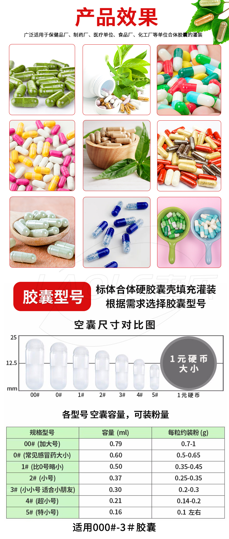 适用胶囊: 000#、00#、0#、1#、2#、3#、4#机制标准胶囊
