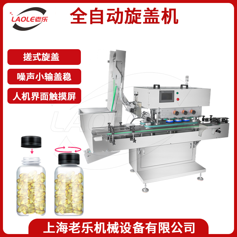 理盖机把盖子送到瓶口,压盖后进入轨道,耐磨橡胶轮滚动拧紧